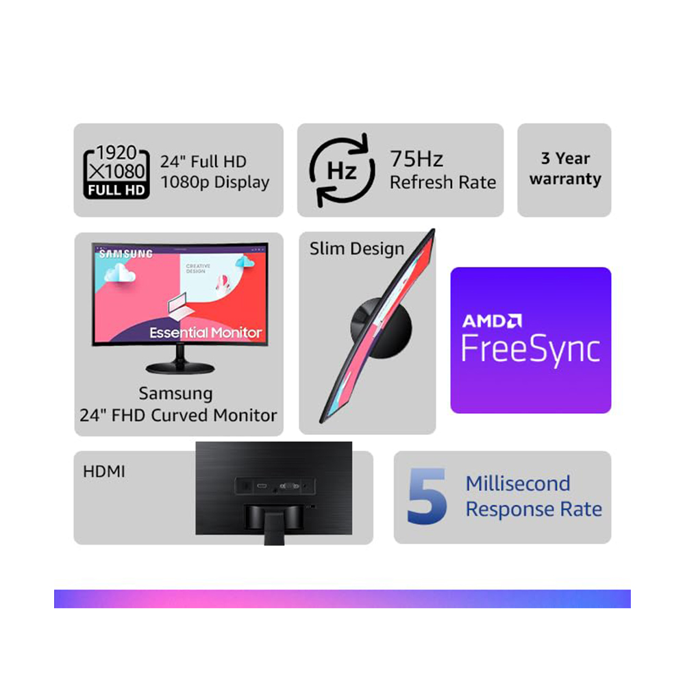 Samsung 24-Inch(59.8Cm) Fhd, 75 Hz, 1800R Curved 1,920 X 1,080 LED Monitor, Va Panel, Slim Design, AMD Freesync, Game Mode, Flicker Free, Hdmi, Audio Port (Ls24C360Eawxxl, Black)
